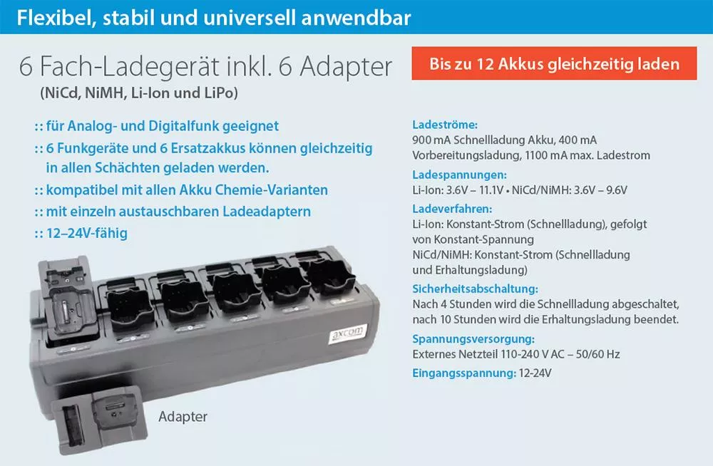 - gleichzeitiges Laden von 6 Funkgeräten und 6 Ersatzakkus