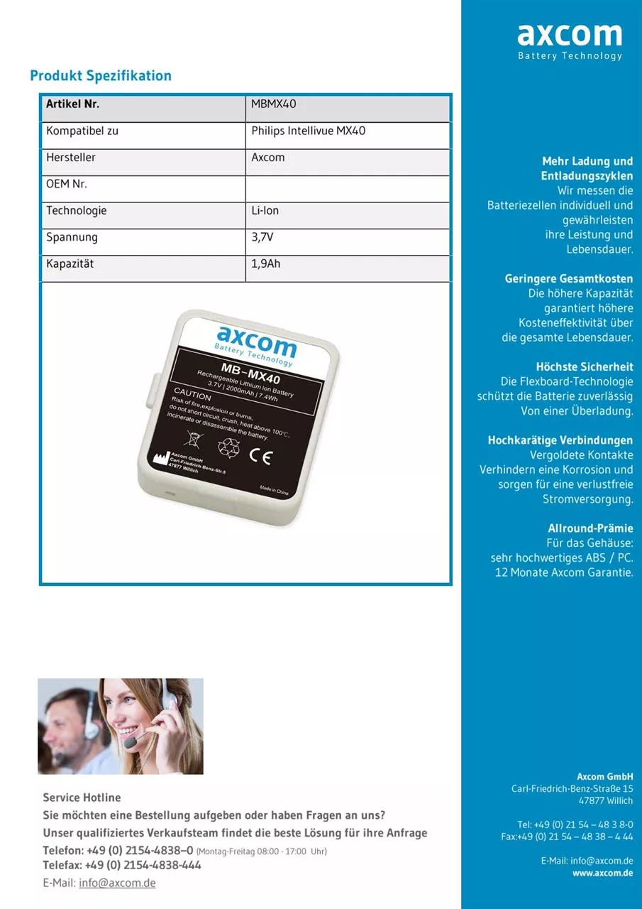 Der Lithium-Ionen-Akku MBMX40von Axcom ist mit demPhilips Intellivue Patientenmonitor MX40 kompatibel. Dankjapanischer Qualitätszellen, seiner soliden Verarbeitung und Passgenauigkeit zeichnet er sich durch eine besonders hohe Langlebigkeit aus. Dazu überzeugt der Akku mit einem hervorragenden Preis-Leistungs-Verhältnis.