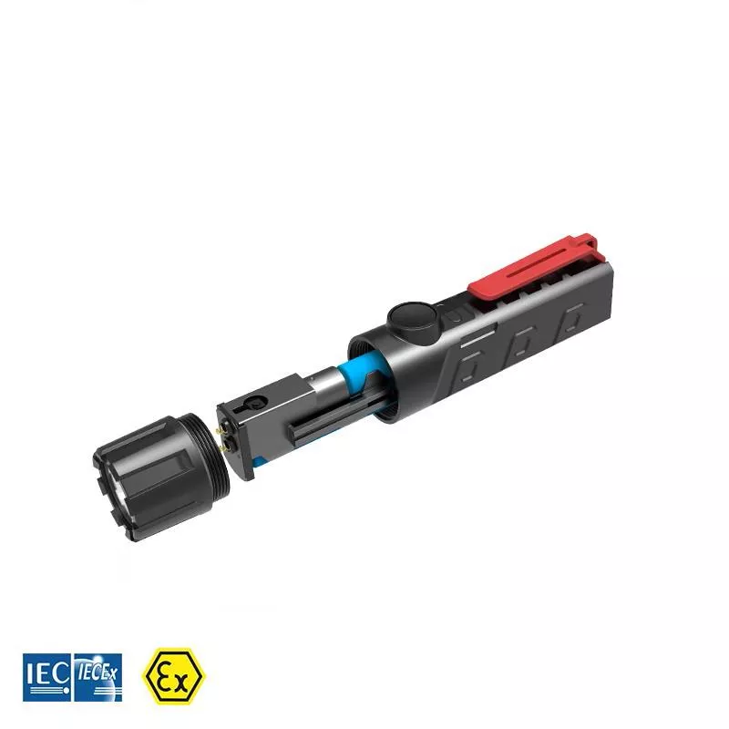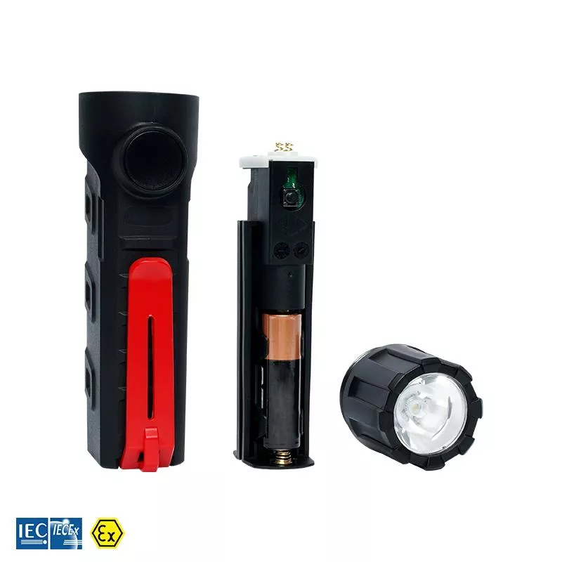 ExMP31N ist eine eigensgesicherte explosionsgeschützte LED-Taschenlampe. Sie ist geeignet für Zone 0/1/2 und Zone 21/22. Das Gehäuse besteht aus Hochleistungsnylon, verfügt über ein benutzerfreundliches Design und ist antistatisch, leicht, stoßfest, korrosionsbeständig, ölbeständig und alterungsbeständig. Der rote Clip der Lampe kann abgenommen werden. Die Taschenlampe wird mit 3 AA-Alkaline-Batterien betrieben wodurch Ausfallzeiten minimiert werden.Die hohe Leuchtstärke der Taschenlampe bleibt auch im Laufe des Entladezyklus erhalten. Passend zur Taschenlampe bieten wir einen Gürtelclip an.